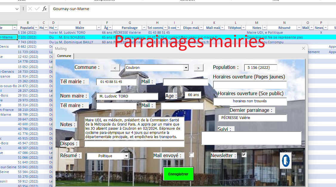 Le fichier permet la visualisation des données sur le maire et la commune, la modification, et le passage aux communes suivantes précédentes selon l'ordre choisit.