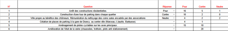 Sous forme de google sheet, elle permet de faire un sondage avec plusieurs questions, dans votre commune, votre ville ou d'autres périmètres. Un graphique vous permet d'évaluer les réponses.